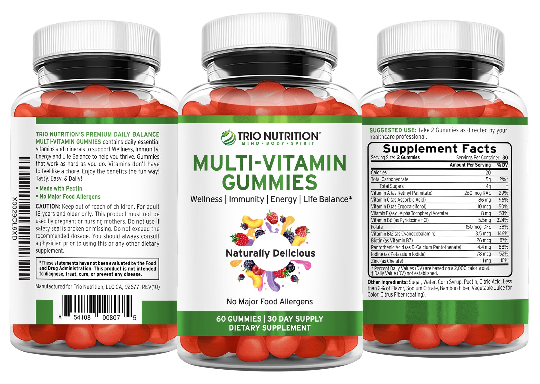 TRIO NUTRITION Premium Naturally Delicious Daily Multivitamin Gummies for Men & Women| No Major Food Allergens | Essential Vitamins & Minerals - Zinc. Fuel your daily energy needs and bolster your immune system.* Here's why our delicious multivitamin gummies should be your top choice: